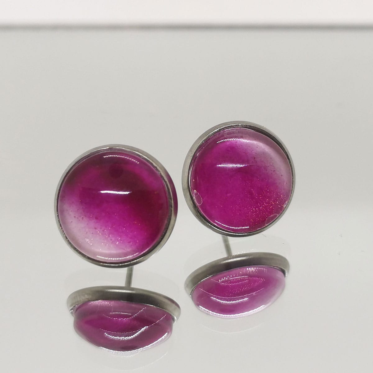 Näyttävät, Encaustic art nappikorvakorut-liila joissa aito maalaus lasinalla. Maalauksen sävyt vahvistuvat jos asusteissa on samaa sävyä. Ihana lahjaidea!