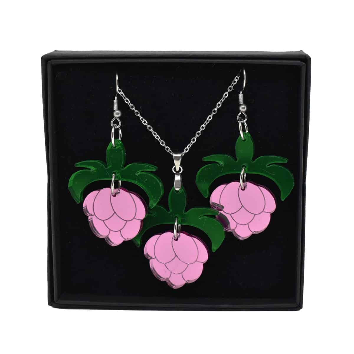 Ihana kesäinen Korusetti Vadelma sisältää Vadelma korvakorut ihanan kevyestä peiliakryylistä ja kaulakorun yhdellä vadelmalla varustettuna.