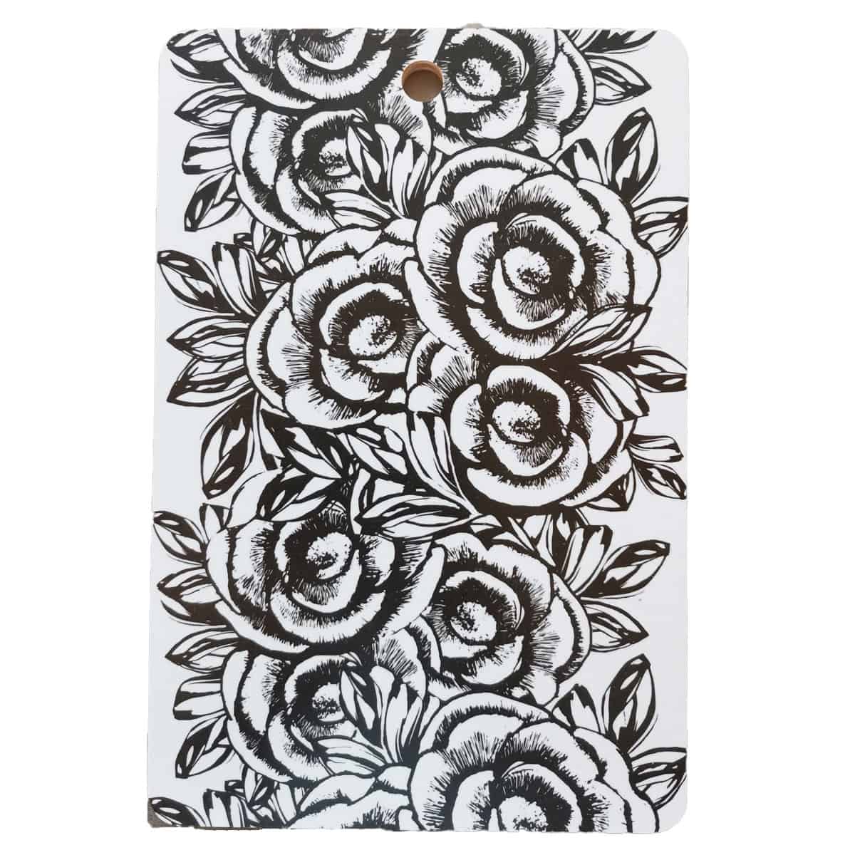 Näyttävä Leikkuulauta Ruusu on upea katseenvangitsija mutta myös erittäin hyödyllinen käyttöesine keittiöön. Tyylikäs mustavalkoinen ruusukuviointi joka sopii täydellisesti onnitteluun, uuteen kotiin, äitienpäivään tai ihan itselle.