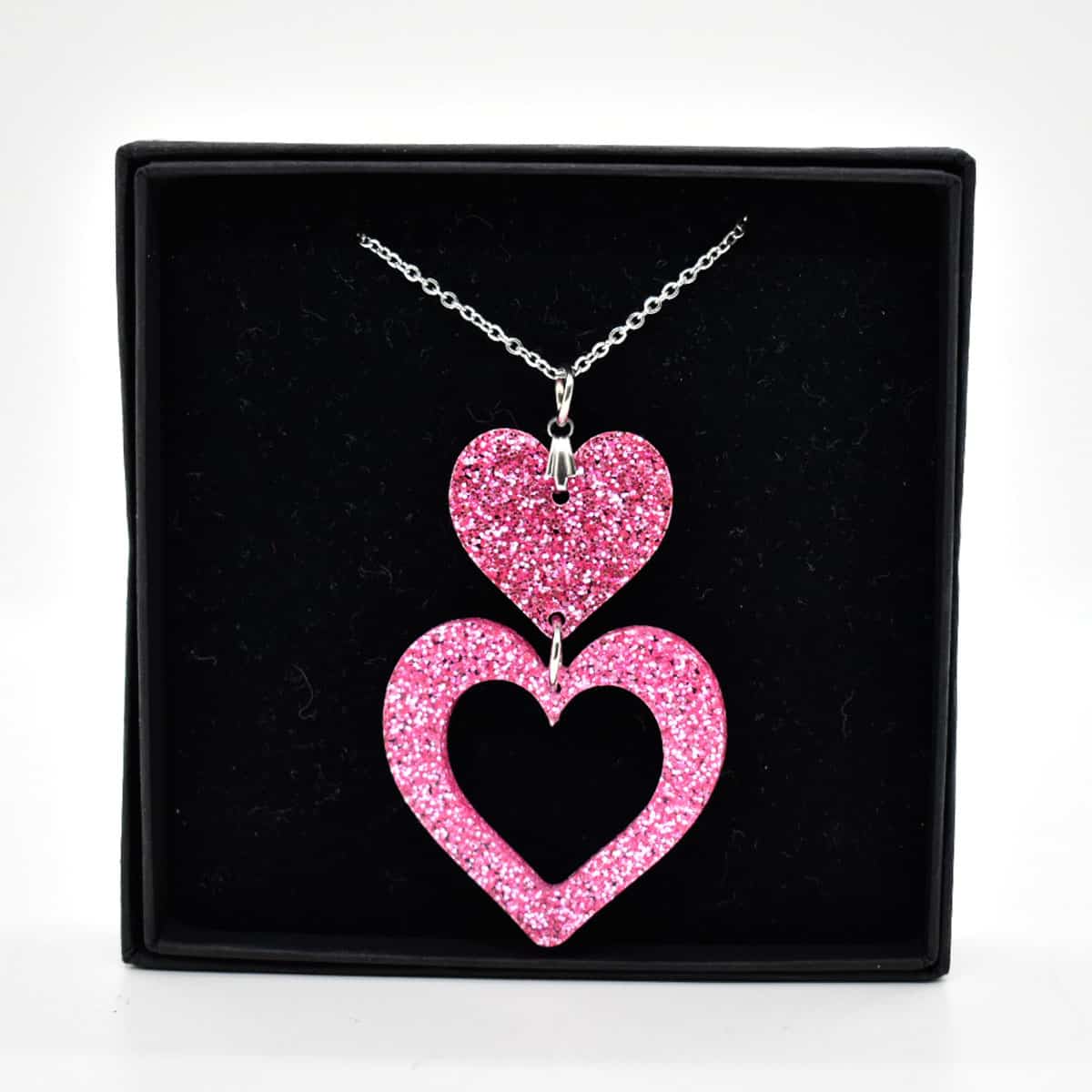Pinkki sydän kaulakoru on kevyttä glitteri akryyliä molemmin puolin.
