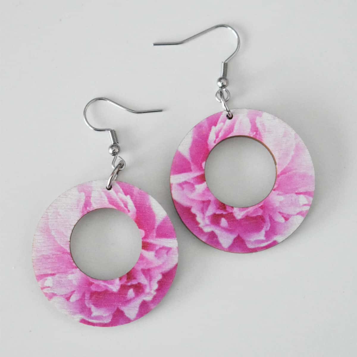Kauniit vaaleanpunaiset Pioni korvakorut! Pioni korvakorujen värit vaihtelevat kuten oikeassakin pionissa miltei valkoisesta tummaan vaaleanpunaiseen. Korvakorut ovat kevyttä, suomalaista sertifioitua koivuvaneria ja kuviointi on koruissa molemmin puolin.