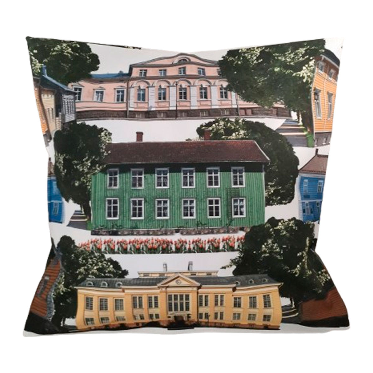 Ihanat Raahen värikkäät talot sisustustyynynpäällinen saatavilla nyt! Kuviointi molemmin puolin kankaassa.